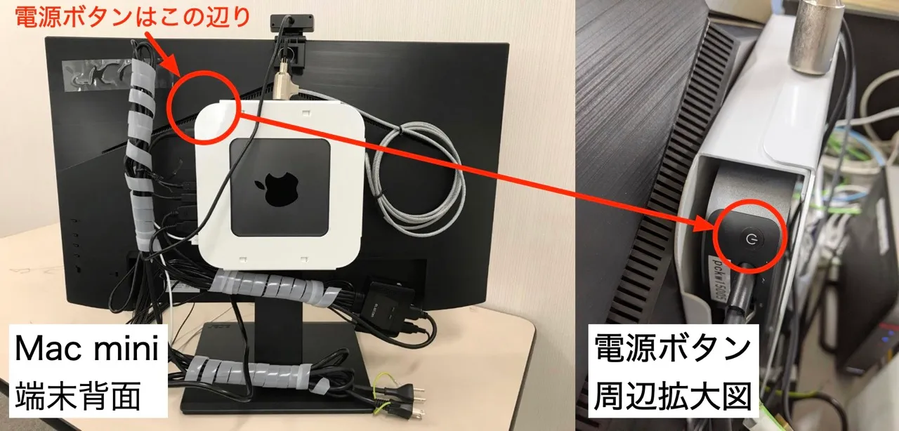 Mac mini端末では,端末本体がディスプレイの裏側に設置されています.本体右側背面の中央上部にあるボタンが電源ボタンです.