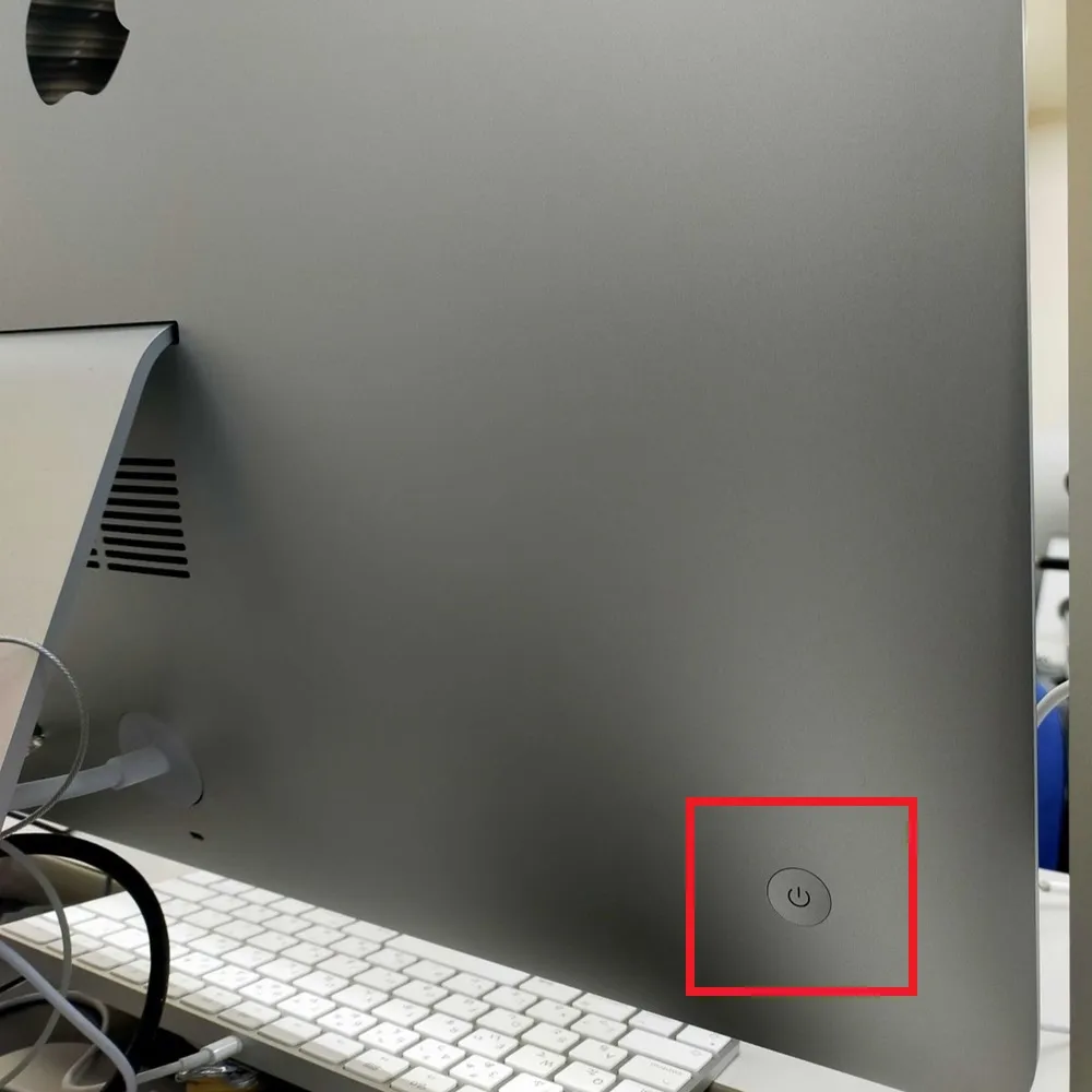 iMac端末では,本体左側背面にある丸いボタンが電源ボタンです.