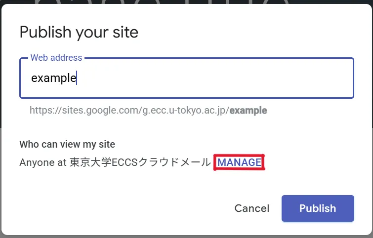 - If you select “The University of Tokyo ECCS Cloud Email”, only ECCS Cloud Email users will be able to view the site. Select this option if you want to limit the publication range to university members.