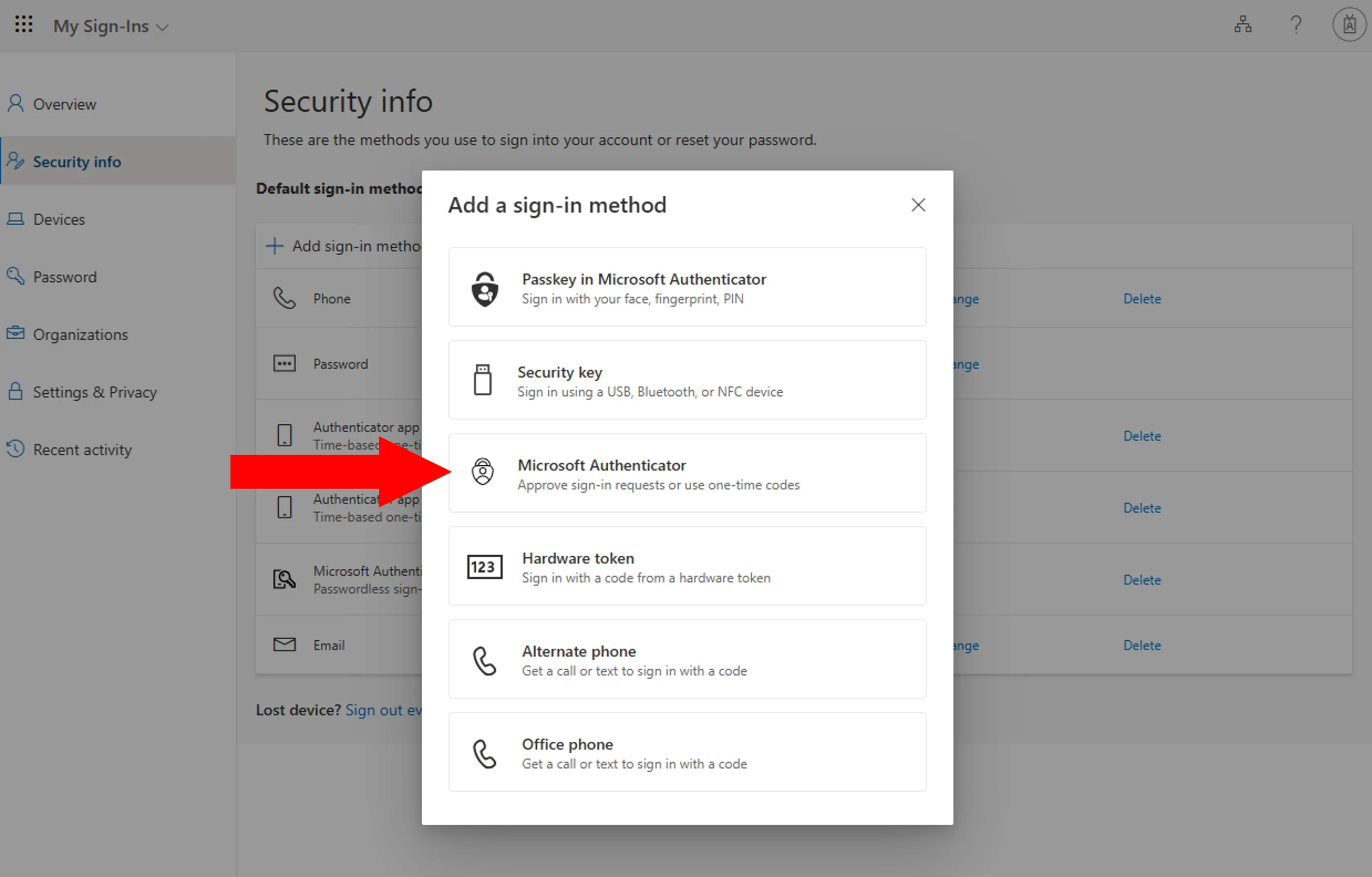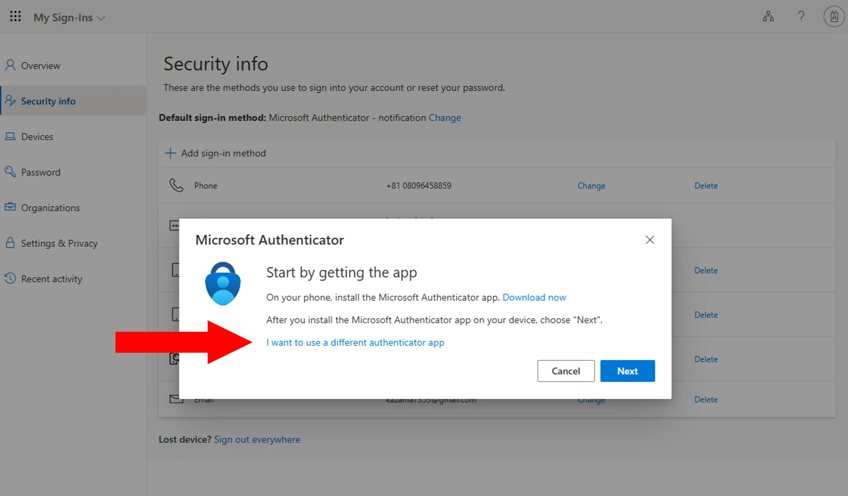 Next, add alternative verification methods (second and subsequent methods) from the Security info page