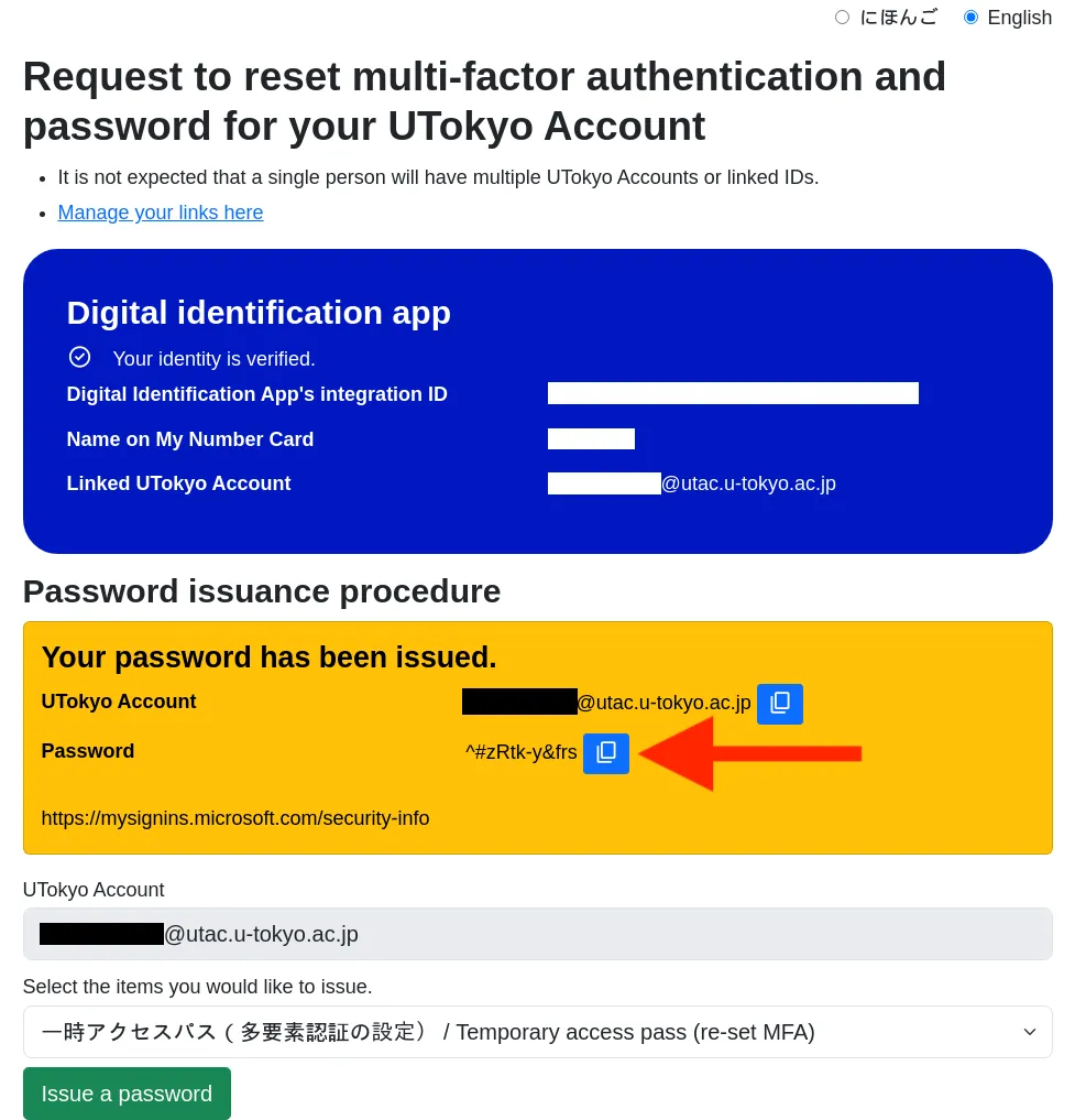 - Click “Request to reset multi-factor authentication and password for your UTokyo Account”