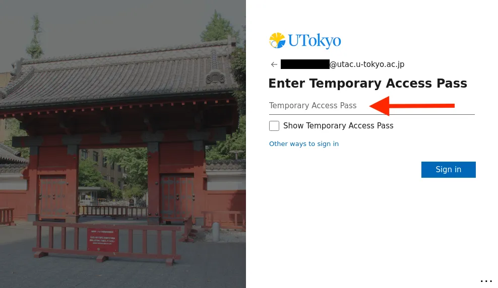 - You will be asked to sign in. Enter your UTokyo Account ID for the ID and the temporary access pass you just issued for the password, then sign in.