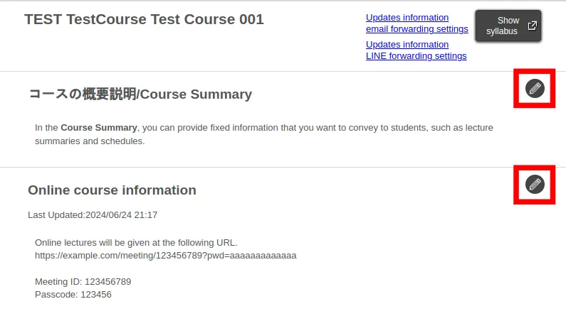 To edit these sections, click (the pencil icon) located at the right end of the course page. Note that you can also access the editing screen for Course Summary through Course Settings > Course Summary.