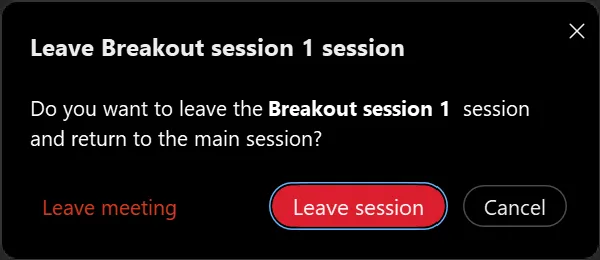 - Leave: Click this button to leave the meeting. If you are in a breakout session, you can press this to leave the breakout session and return to the main meeting.
