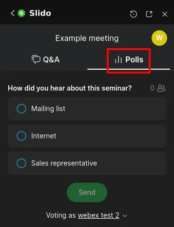 - When the host runs a Poll, a response page will appear under the Voting tab of the participants’ screens.