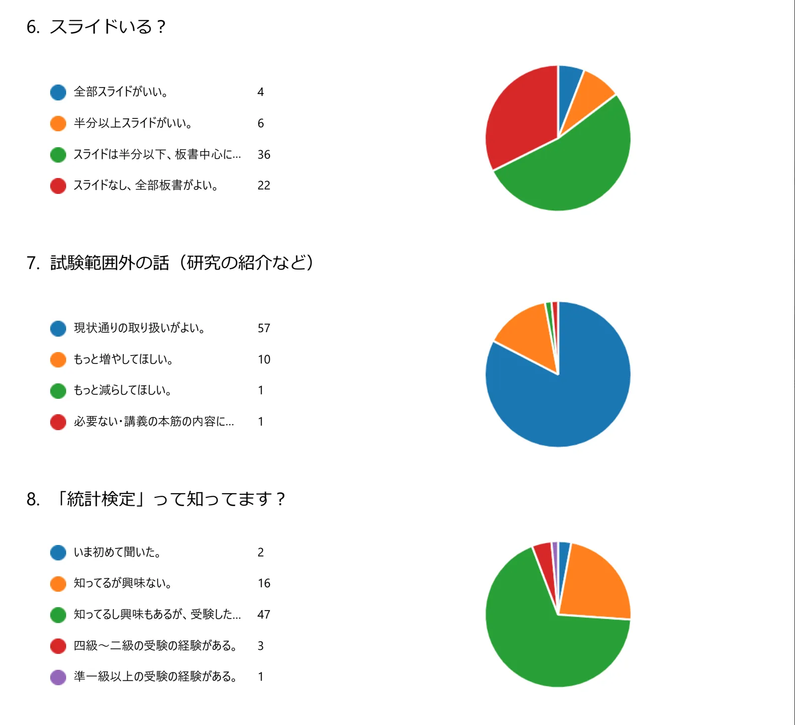 もともと学部が実施している授業運営に関するアンケートはあったのですが、結果の共有がスムーズでなかったり、自分が知りたい項目が含まれていなかったりしたので、S1 タームに Google Forms を用いて独自のアンケートを実施しました。回答者は履修者 200 名のうち 70 名ほどでしたので、多少の偏りはあるかもしれませんが、それでも大変参考になりました。このアンケート結果を生かして S2 タームの授業運営を行いました。