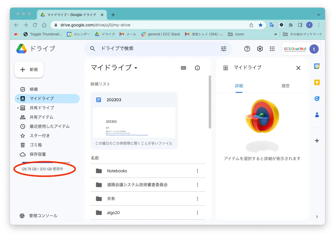 - 本システムで設定した容量はGoogleドライブのWebアプリケーション上で確認できます.