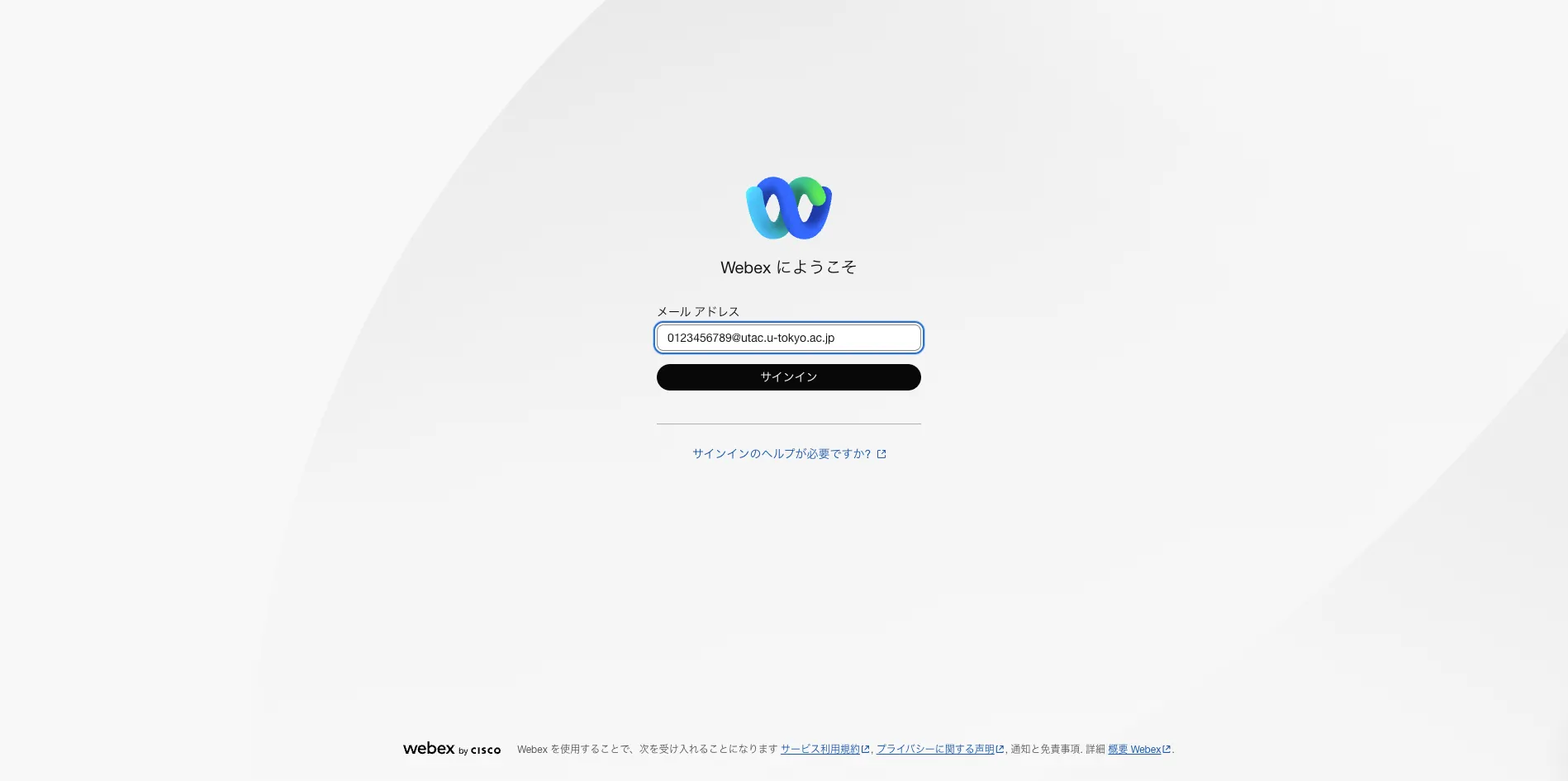 3. Webexのサインイン画面が開くので,UTokyo Account(数字10桁の共通ID + @utac.u-tokyo.ac.jp)を入力してください.