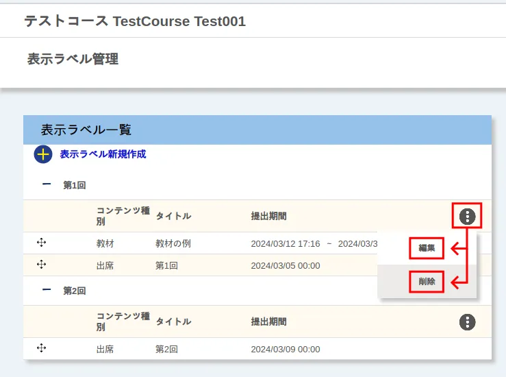 なお,ラベルは,該当するコンテンツがない履修者を含め,教員側・履修者側両方で表示されます.個人情報など,履修者に見られては困る内容をラベルに含めないように注意してください.